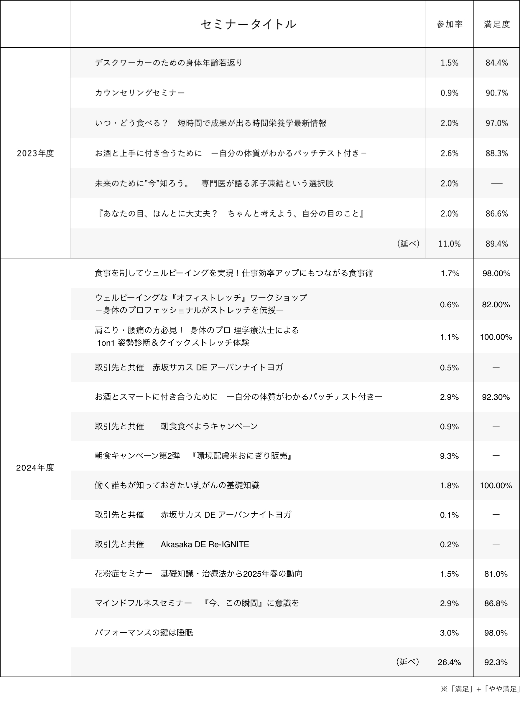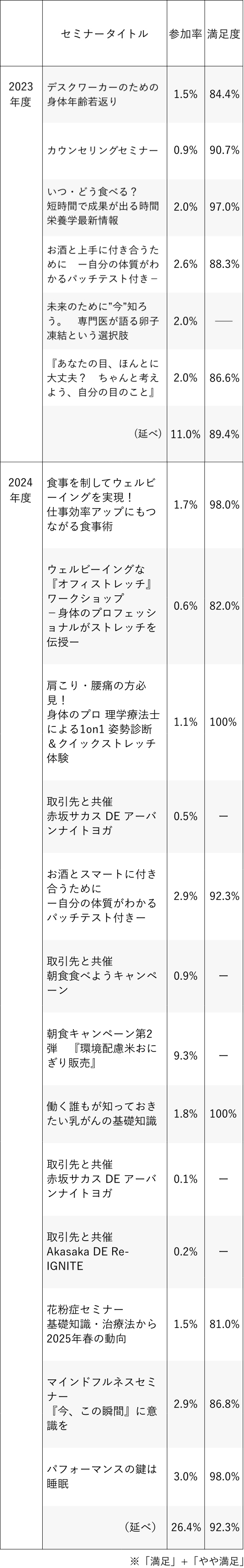 2024年度は、計13回のセミナー・イベントを開催し、延べ1273名が参加しました。いずれの回でも満足度は80%以上であり、ヘルスリテラシーの向上に繋がっています。
