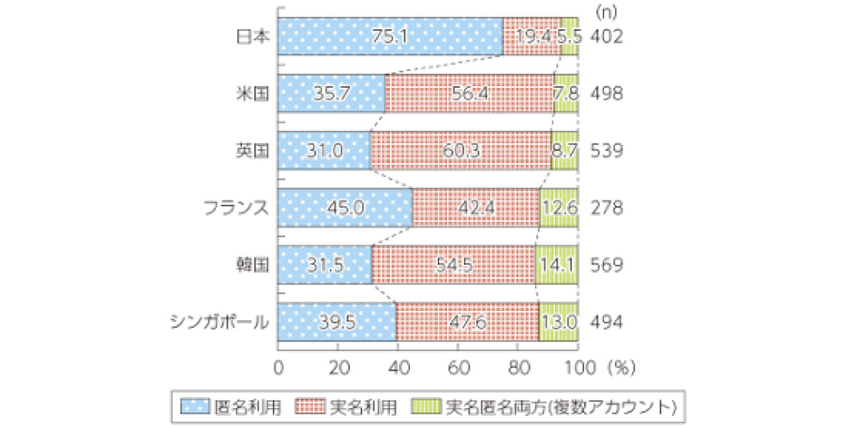 また、総務省がまとめている調査データによれば、世界各国のTwitterの匿名・実名率を比較すると、日本人の匿名利用率は7割超と高いスコアになっており、身元がバレないSNSアカウントを持つことは日本人特有の傾向といえそうです。