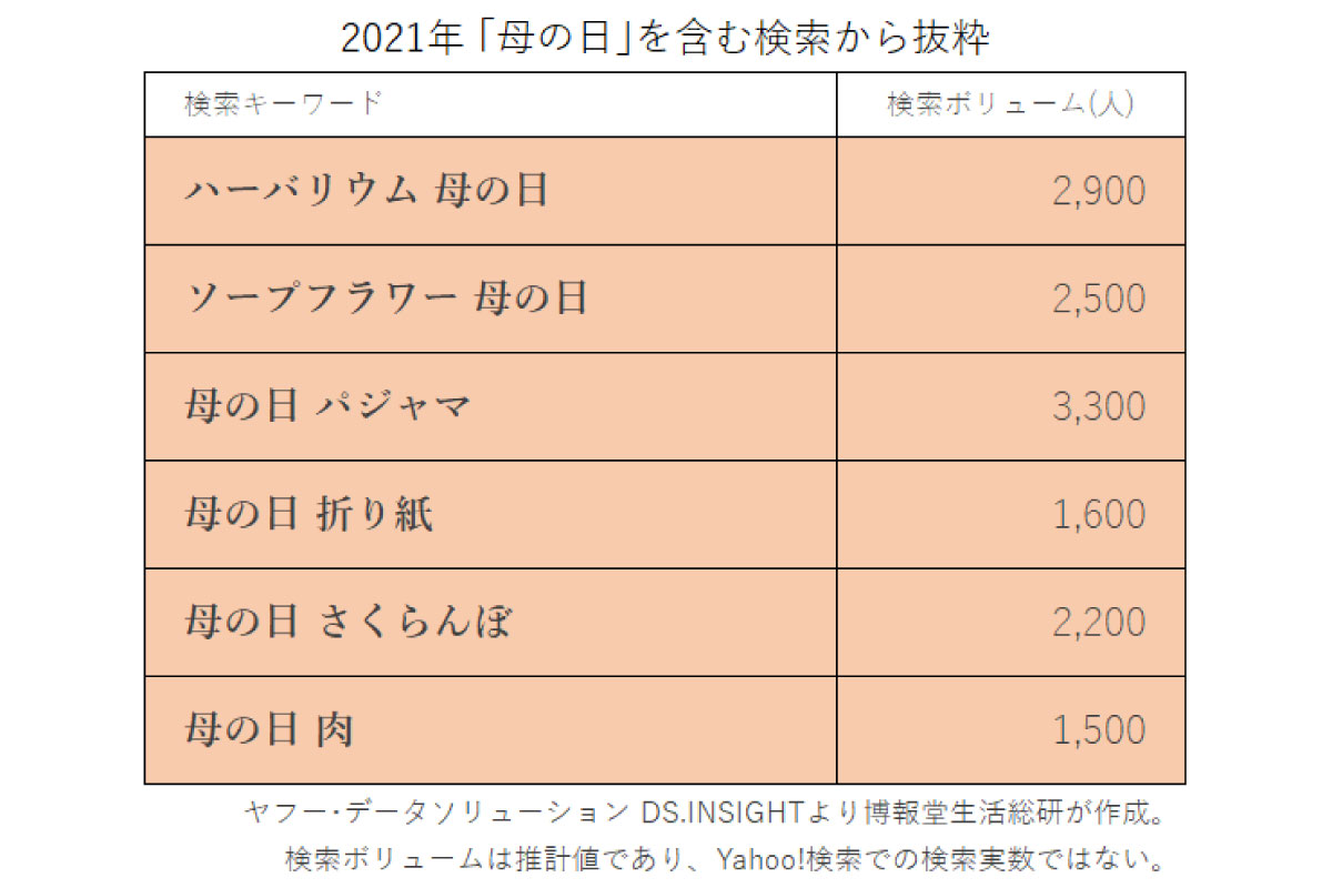 ただそれだけに、毎年何を贈るか悩みますよね。そこでヤフー株式会社が提供するデータ分析ツール「DS.INSIGHT」を使って、2021年1年間の「母の日」を含む検索データから、誕生日のプレゼントにも使えそうで、私が「おっ!」と思ったものを抜き出してみました。