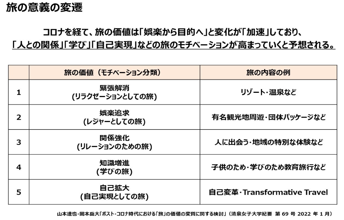 僕は清泉女子大学の先生と、ポストコロナに向けた「旅の価値の変化」を整理しているのですが(図表)、大昔に存在した巡礼とか哲学者の旅のように、関係強化の旅とか、学びにフォーカスした旅、自己変革を求める旅が今後もっと増えていくだろうと考えています。これまでマスツーリズムの陰に追いやられていた、旅が持っていた本来の価値が改めて見直されるのではないかと思うのです。話をうかがっていると、デジタルやハプティクス技術も、それぞれの旅のモチベーションに応じて、使われ方は大きく違ってくるだろうなと思いました。