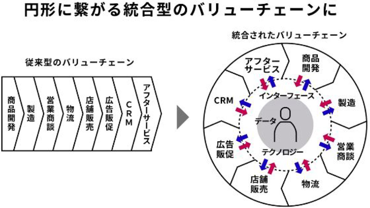 企業のバリューチェーンは、市場調査から商品開発、販売からアフターサービスなど、これまでは直線的なつながりで捉えられてきたと思いますが、これからは円形につながるバリューチェーンが構成されていくと考えています。それぞれのバリューチェーン毎のインターフェースから生活者のデータを入手し、それを統合されたデータ基盤の中に格納していく。そして、そのデータを活用して、生活者とのインタラクションを設計していくようになるでしょう。中核に大きな生活者データの基盤があって、あらゆる場面で生活者のニーズに応えていく円形のバリューチェーンが形成されるのです。