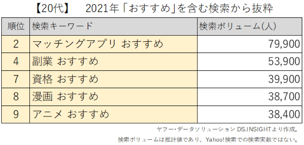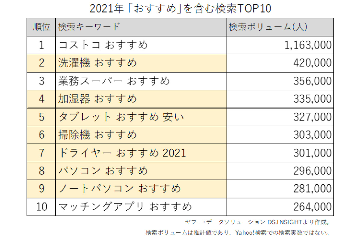 ヤフー株式会社が提供するデータ分析ツール「DS.INSIGHT」を使って、2021年1年間の検索データの中から、「おすすめ」を含む検索の上位10位から傾向を探りました。