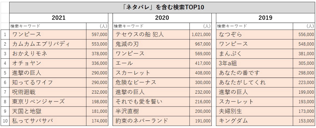 ヤフー株式会社が提供するデータ分析ツール「DS.INSIGHT」を使って、2019年~2021年の年間検索データの中から、「ネタバレ」を含む検索の上位10位をランキングにしています。(見やすくするために「ネタバレ」というワード自体はランキング表記から削除しております。)※「DS.INSIGHT」では統計化されたデータのみを扱っており、個人を識別可能な情報は含まれません。