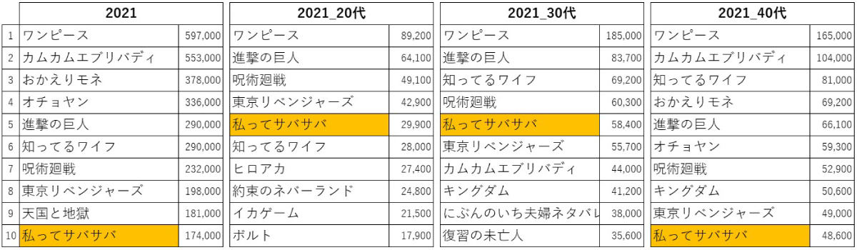 ランキングをよく見てくれた方は、「私ってサバサバ」というタイトルが気になったかもしれません。2021年全体で10位、20代・30代では5位、40代でも10位にランクイン。