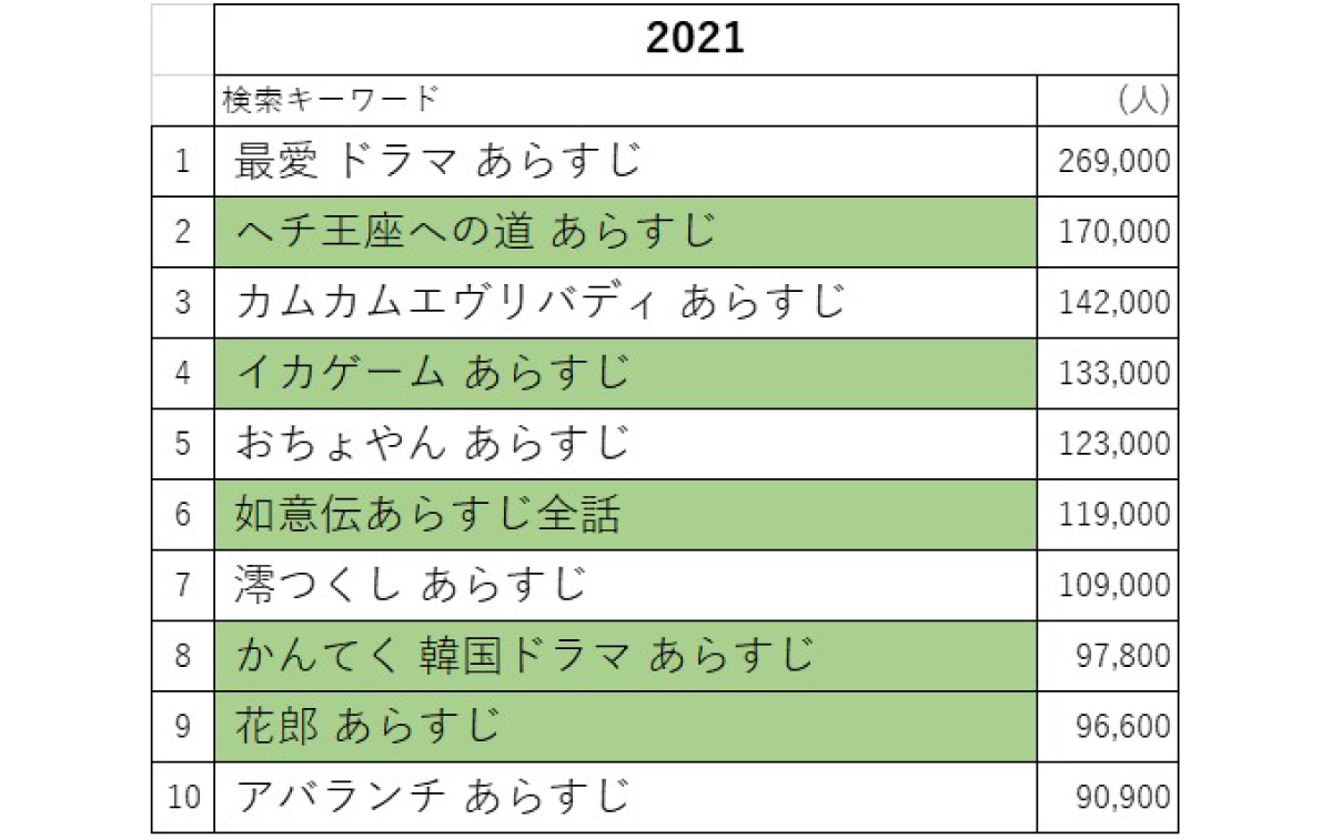 これは、見始めてしまう前に概要を知っておきたい!いう検索インサイトからくるものかと考察します。というのは、韓国では、一般的な日本のドラマと違い週に2回放送があって24話構成が多かったり、人気が出て2クールにわたることでさらに増えたりして、長編シリーズであることが特徴です。6位に位置している中国ドラマの『如懿伝』も同様で、なんと全87話! 面白そうだから気になるけど、見始めて“違うな”って後悔したくない、そんな気持ちがみえてきます。これは1話15分とはいえ150話ほどの「朝ドラ」にも共通している要素なので、同じような理由でランクインしているのかもしれません。
