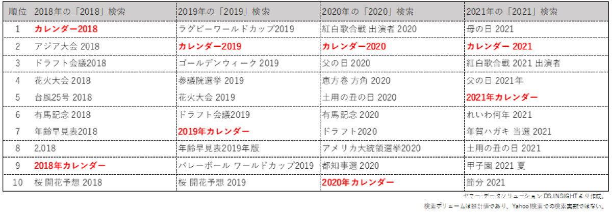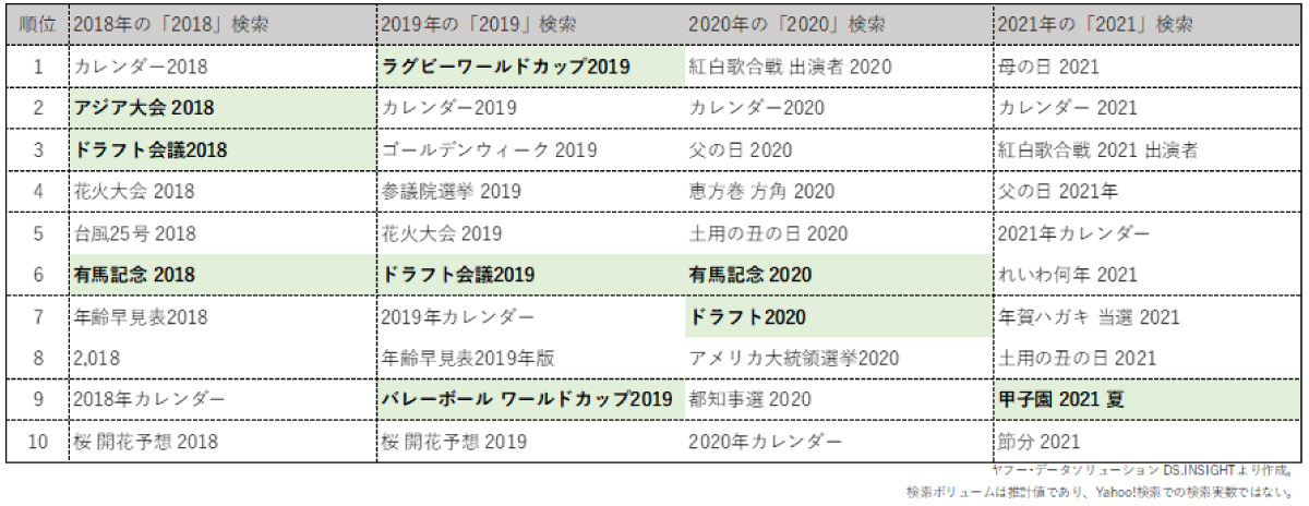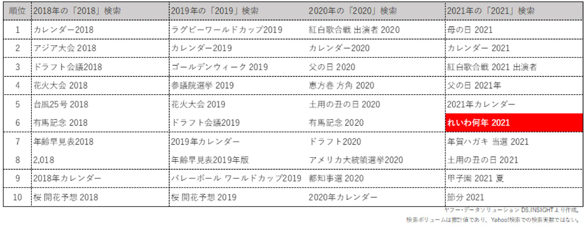 ヤフー株式会社が提供するデータ分析ツール「DS.INSIGHT」を使っていると、2021年に「〇〇 2021」という検索が多い事に気づきました。私も広告の仕事の中で、トレンドや新商品の情報などを把握するのは重要で、たびたび年号を入れて検索することがあります。