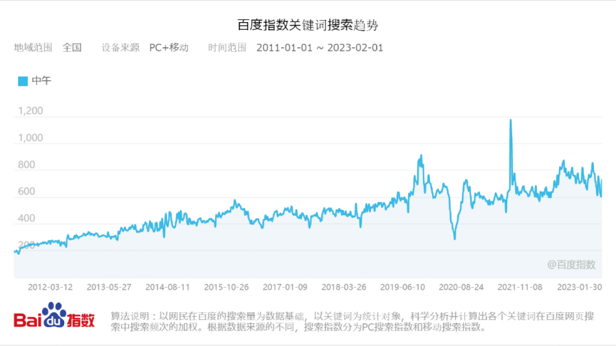 日本では授業や仕事の合間に昼寝をする機会は、あまりないかもしれません。しかし、中国では、幼稚園から高校まで、昼休みが長く一度家に帰り、ご飯を食べた後昼寝をしてから再び登校する慣習があります。大学についても、生徒の多くは大学の敷地内の学生寮に住むため、昼休みは一度部屋に帰り昼寝をするのが一般的です。こういった昼食後に寝る習慣は中国語で「午睡(ウーシュイ)」といい、忙しい社会人になっても根強く残っていることから、「昼寝フリー(中国語で“午睡自由”)」を求めてにあの手この手で対策を講じています。「昼(中国語で“中午”)」という検索ワードをBaidu指数で調べてみると、下記のように昼の過ごし方等に対する関心度が年々高まってきていることが見て取れますね。
