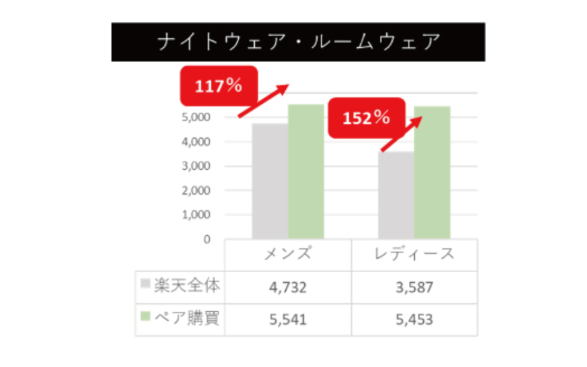ナイトウェア・ルームウェアの楽天全体とペア購買の購入単価の比較