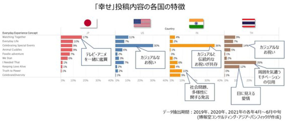 世界の人々が日々どんなことを「幸せ」と捉えているか、日本、アメリカ、インド、タイの4カ国のTwitter投稿分析結果をご紹介します。前回 は日本の特徴をピックアップしました。
