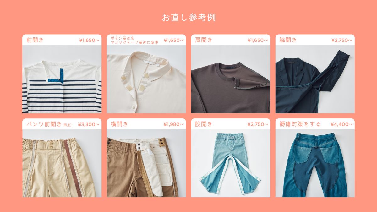 冨来:すでにいくつかのアパレルブランドで、体の不自由を考えた服の取り組みはあったのですが、特定の障害を前提として一定の量を生産するやり方では経済合理性が合わず、結果販売価格が高くなってしまったり、サイズが合わなかったりで、あまり広がっていない状況でした。リペアも、通常の業者さんだとメニューにない特別なお直しは受けていなかったり、特別料金が発生してしまうのが現状でした。じゃあ、みなさんどうしているかというと、当事者のご家族が、自身で家族が着たい服が着られるように、身体の不自由に合わせてリペアしているケースが多かったんです。そして、その特別なお直し技術を同じように困っている人に提供したいと思っていることもわかりました。そのインサイトに気付けたのは、サービスを立ち上げるためにクラウドファンディングを行ったとき。そこで、自分もお直しの提供者になりたいという声をいただいて、そのみなさんを組織化していまのサービスを提供しています。