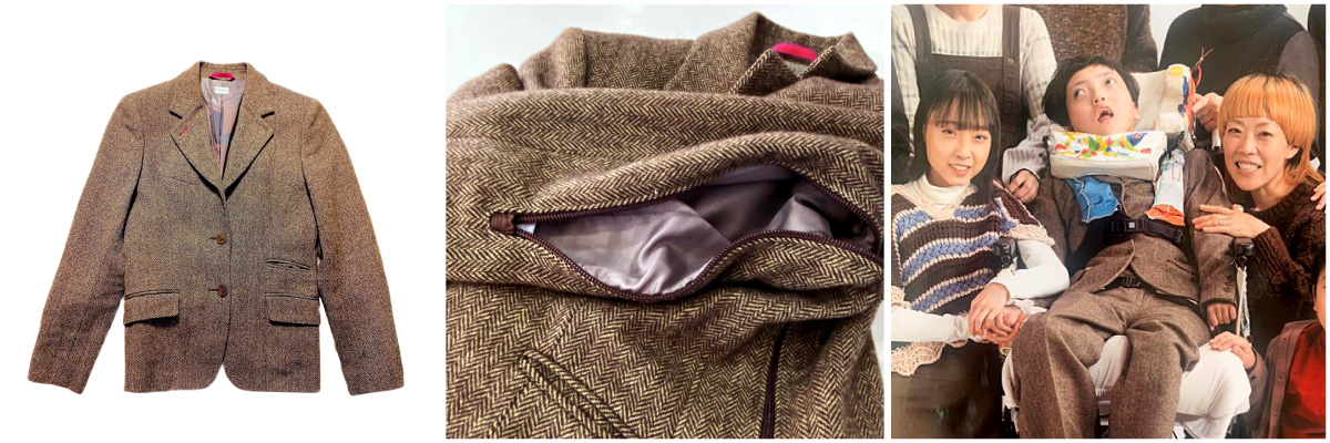 志村:お母さんが成人式で着たスーツを、娘さん(次女)のためにリメイクしたいというオーダーをいただきました。娘さんは、首、体幹、手足の自由がきかず、寝たきりの状態。カチッとしたスーツは脱ぎ着が大変で、お母さんにとっても娘さんにとっても一苦労ということでした。そこで、ジャケットの脇から袖までファスナーで開けるようにしたり、パンツのウエストをゴム仕様にしたり。