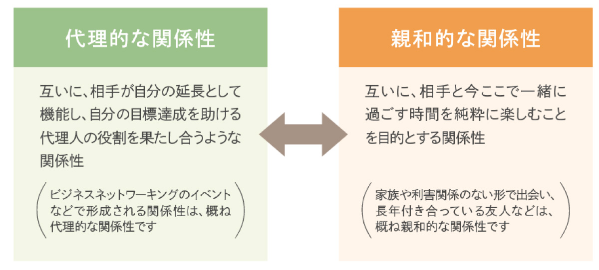 まず、関係性には、大きく『代理的な関係性』と『親和的な関係性』というベクトルが存在します。