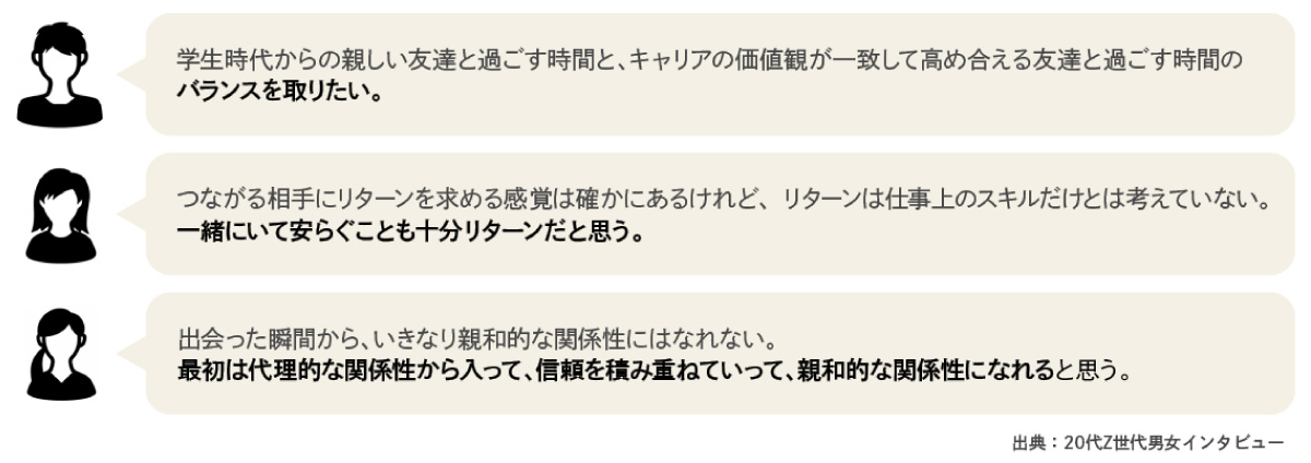 そのような中で、20代Z世代からは、親和的関係性、代理的関係性それぞれの価値を認め、しなやかに向き合っていこうとする声が聞かれました。