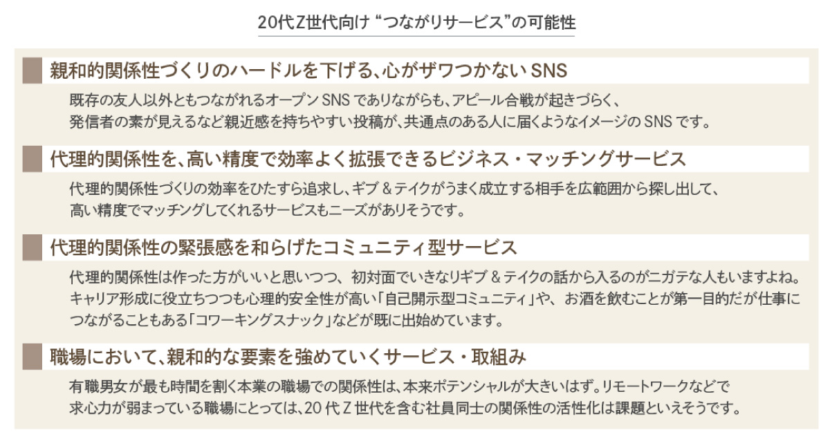 いずれにしても、20代Z世代にとって、代理的関係性と親和的関係性の両方をバランスよく育んでいくことは一層重要な課題になりそうです。