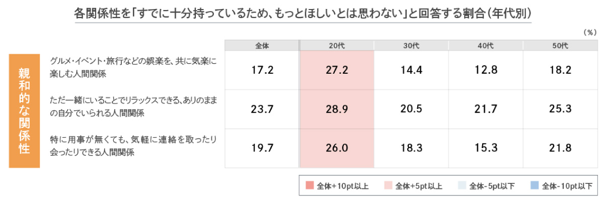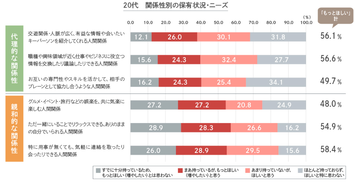 一方で、20代Z世代で特徴的だったのは、「もっとほしい(増やしたい)」と回答しなかった人たちのうち、「すでに十分持っているため、もっとほしいとは思わない」(=これ以上広げなくていい)と答えた割合が、親和的な関係性において高いことです。