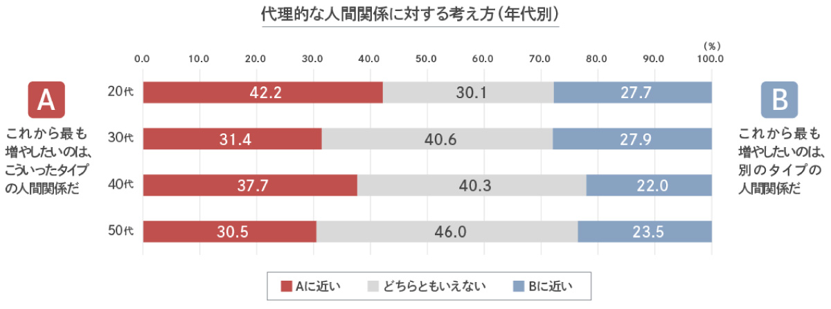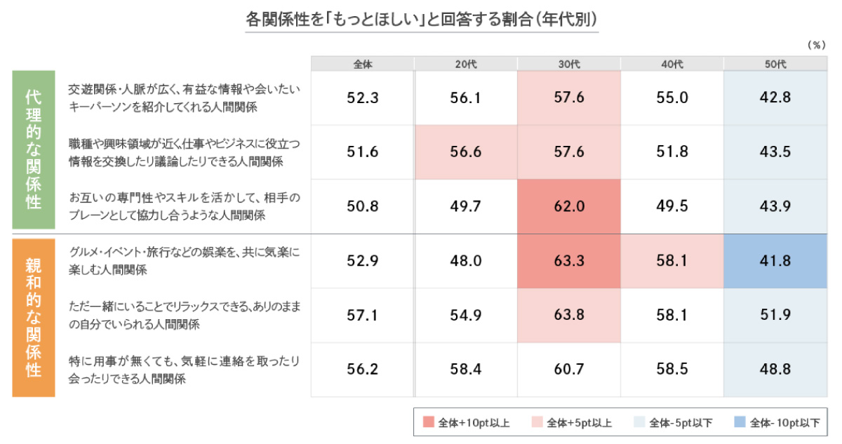 その結果、20代Z世代は、代理的関係性、親和的関係性ともに「もっとほしい(増やしたい)」と考える層が5割前後を占め、他世代と比べても、つながり作りの意欲が必ずしも低いわけではないことがわかりました。