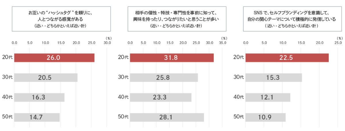 以下のデータからは、20代Z世代が、つながり作りにおいて上記のような感覚を他世代よりも強く持ち、“ハッシュタグ”を拠り所の1つにして行動している様子が伺えます。