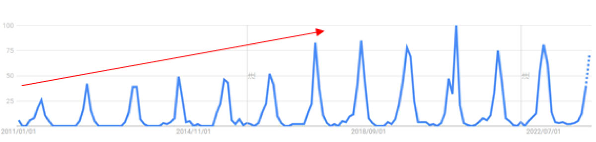 私もオフィスの冷房が効きすぎていて夏風邪をひいてしまった経験があり、同じような悩みを抱えている人がどのくらいいるか、Googleトレンドで「クーラー冷え」と調べてみると2010年代から検索数が上昇傾向にあることが分かりました。