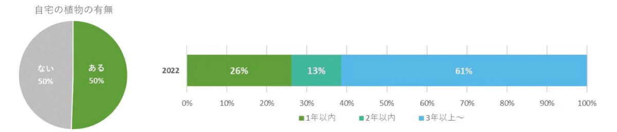「自宅の植物の有無」(左)と「観葉植物を育て始めた時期」(右)
