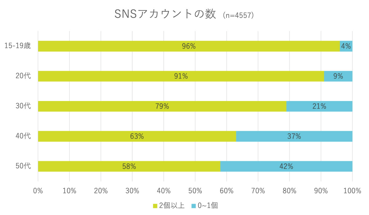 1つ目は、SNSやアバターの普及により、一人が色々な自分を持つ「分人化」が一般化したことです。調査によると、SNSで複数のアカウントを持つ人は15歳~50代のすべての世代で半数を超えています。