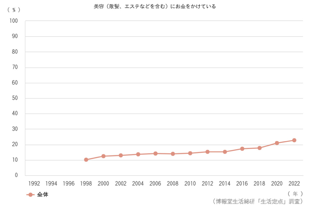 最近では全体の美意識向上により、以前よりも美容にお金をかけている方の割合が増えてきて、過去最高を更新し続けています。