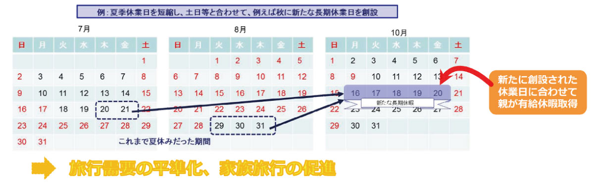 例えば、夏休みを短縮し(夏休み最初の平日2日間と夏休み最後の平日3日間)平日5日間を秋の連休に並べ、家族で長期休暇の取得が可能になるなどです。