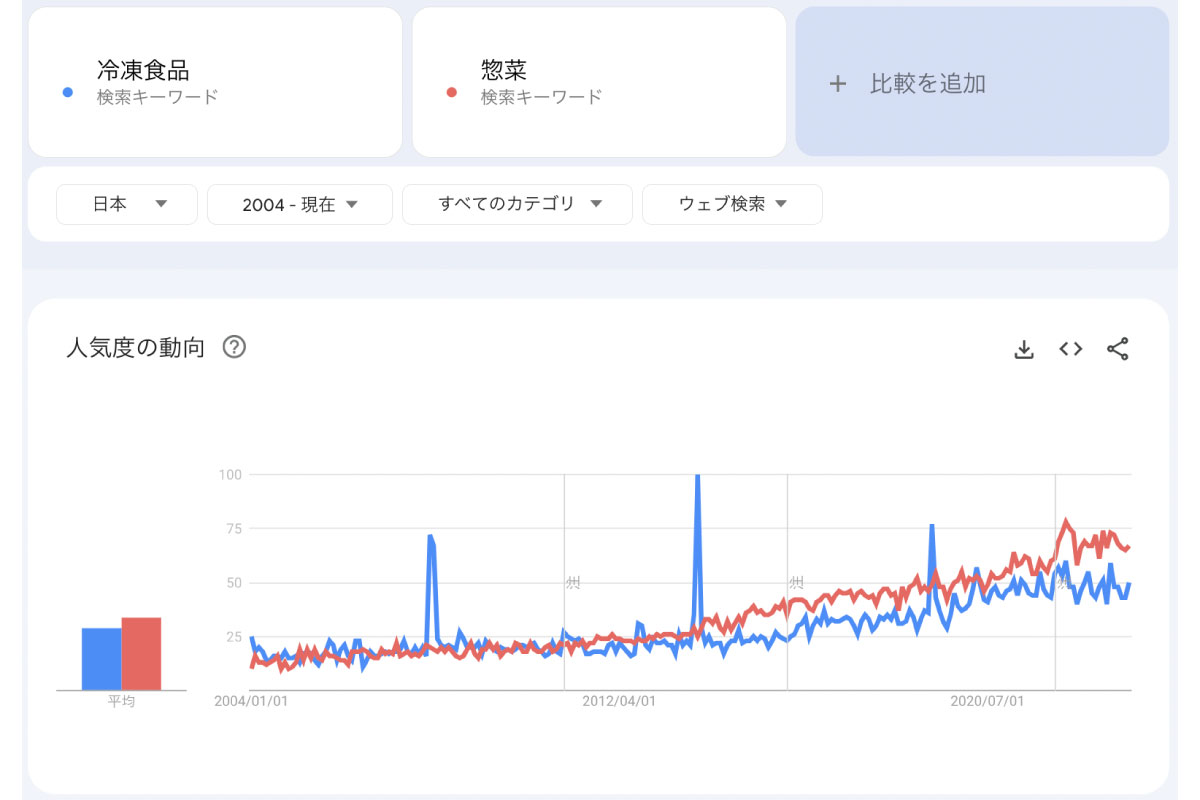 下記のGoogleトレンドにあるように、「冷凍食品」や「惣菜」など出来合いのものの検索数が上昇しています。日本は伝統的に、家庭の食事は内食が主流でありましたが、ここ最近では中食需要が非常に高まっているのがわかります。とはいいつつも、時短や手間抜きのためにすべてを出来合いにしてしまうのはどこか後ろめたさを感じるものですが、その中で新たに生み出されたのが「半手作り」になります。