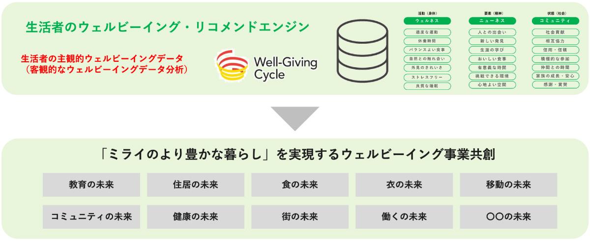 堂上:まず、Well-Giving Cycleの誕生について振り返ると、ベースは「事業共創」にあります。3年前、あるクライアントから“ウェルビーイングな街作り”というお題を与えられたんです。ウェルビーイングの権威である慶應義塾大学の宮田裕章教授に相談したところ「ウェルビーイングは一人ひとり違う。定義付けはできないんです」と。だからこそ「それぞれのパーソナルなデータをもらってリコメンドできれば、ウェルビーイングな人が世の中に増えますよね」とアドバイスをいただきました。そこで、はじめたのがウェルビーイングな共創社会を実現するためのBetter Co-Beingプロジェクトです。