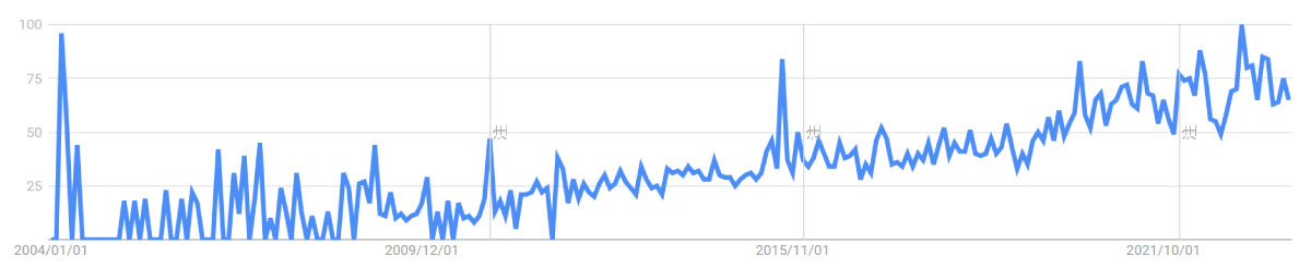 そこで、同じように時間を忘れてコンテンツにのめりこむ人が増えてきているのではないかと思い、Googleトレンドで「没頭」と検索してみると、年々その検索数は増加しており、何かに没頭したいと考える人が増えていることがわかりました。