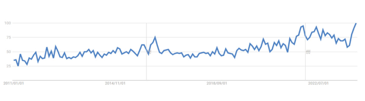 実際に、Googleトレンドの服飾カテゴリで「未来」というキーワードが約10年で2倍近くの検索ボリュームになっており、新たなファッションスタイルのカテゴリを築きつつあります。