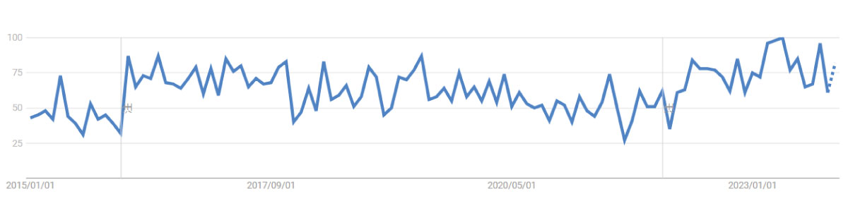 文字通りパンをつまみにお酒を飲む新スタイル。パンに具材を乗せたブルスケッタみたいなもの(オープンサンドとも言う)にワインを合わせたり、バインミーやキューバサンドなど異国情緒漂うパンだったり、惣菜パンをビールで一気に流し込んだり。僕自身も、下町にある朝はパン屋、昼過ぎからパン居酒屋に様変わりするお店でパン飲みセットを頂いたのですが、なんだろう、控えめに言って最高でした。あのパン屋さんに漂ういい匂いも体験価値を高めている気がしますね。Googleトレンドでみると、「パン飲み」というキーワードの検索数がじわじわと伸びている様子がわかります。