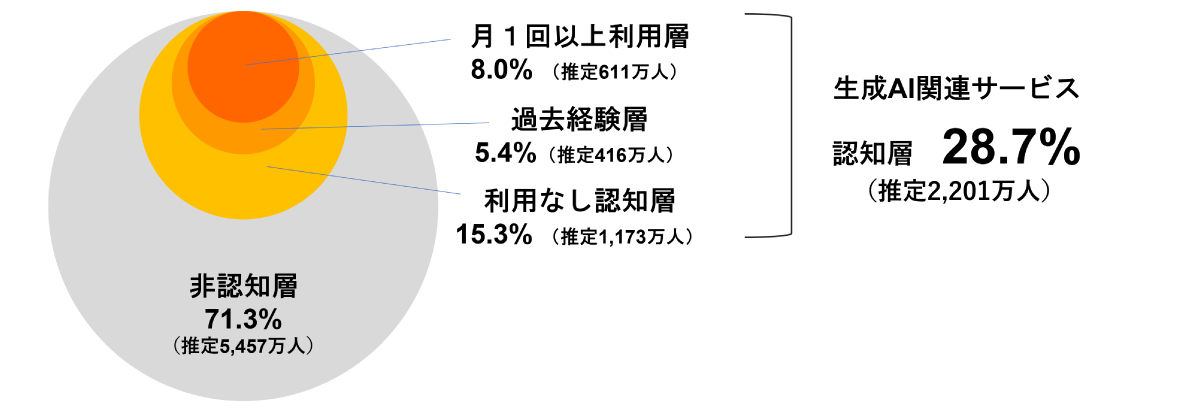 また、利用層も含めて、生成AI関連サービスの認知層は全体の28.7%となった。