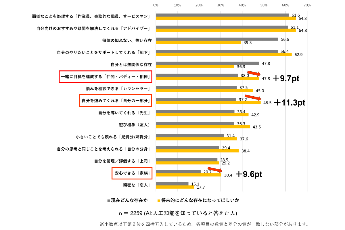 合わせて、将来的にAIがどんな存在になってほしいか期待についても聴取した。1位と2位は現在と同じ結果となったが、現在と将来の差分に着目すると、増加の大きさ順に「自分を強めてくれる自分の一部分」(11.3pt増)、「一緒に目標を達成する仲間・バディー・相棒」(9.7pt増)、「安心できる家族」(9.6pt増)となった。AIに対する、気持ちの面でもより自分に近い存在としての期待感がうかがえる。