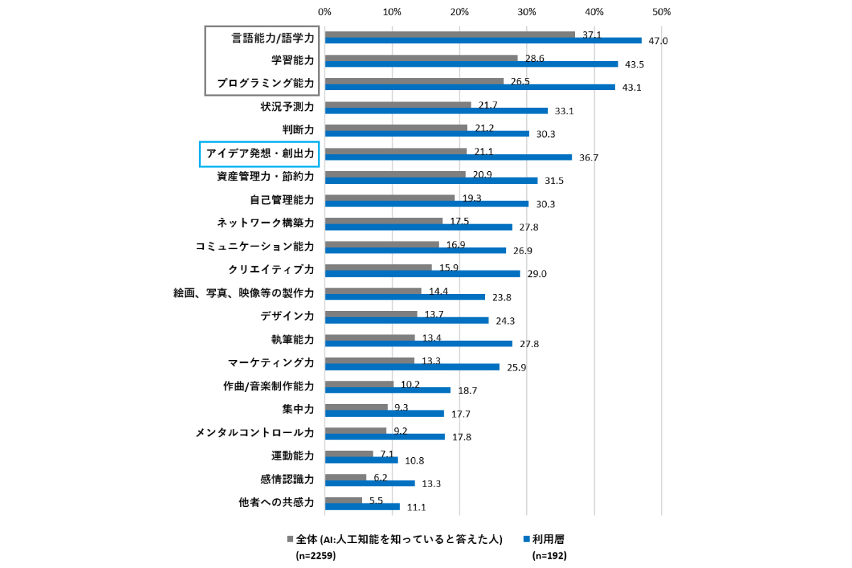 利用層のほうが全項目で高く、上位3項目は全体と同じ順だが、4位に「アイデア発想・創出力」(36.7%)が入り、利用層はAIの創造性に対する期待が高いことがうかがえる。