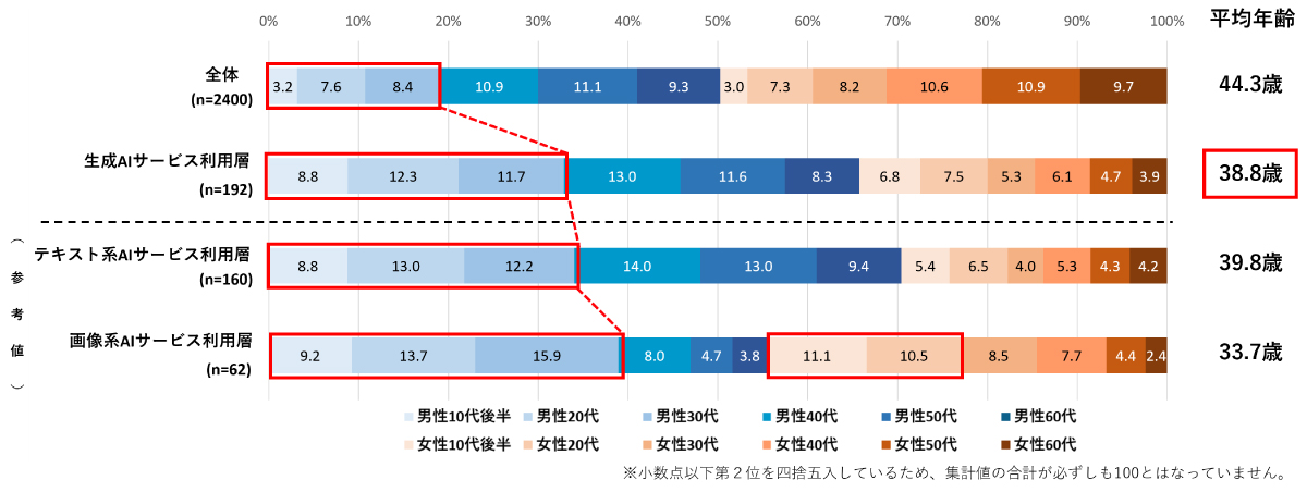 生成AIサービス利用層(利用層)の平均年齢は38.8歳。性年齢構成をみると、各AI関連サービス利用層において、全体と比べて10~30代男性の比率が高い。画像系AIサービス利用層は10~30代の男性が全体の約4割を占める。また10代後半女性が11.1%、20代女性が10.5%と、若年女性の高さも目立つ。