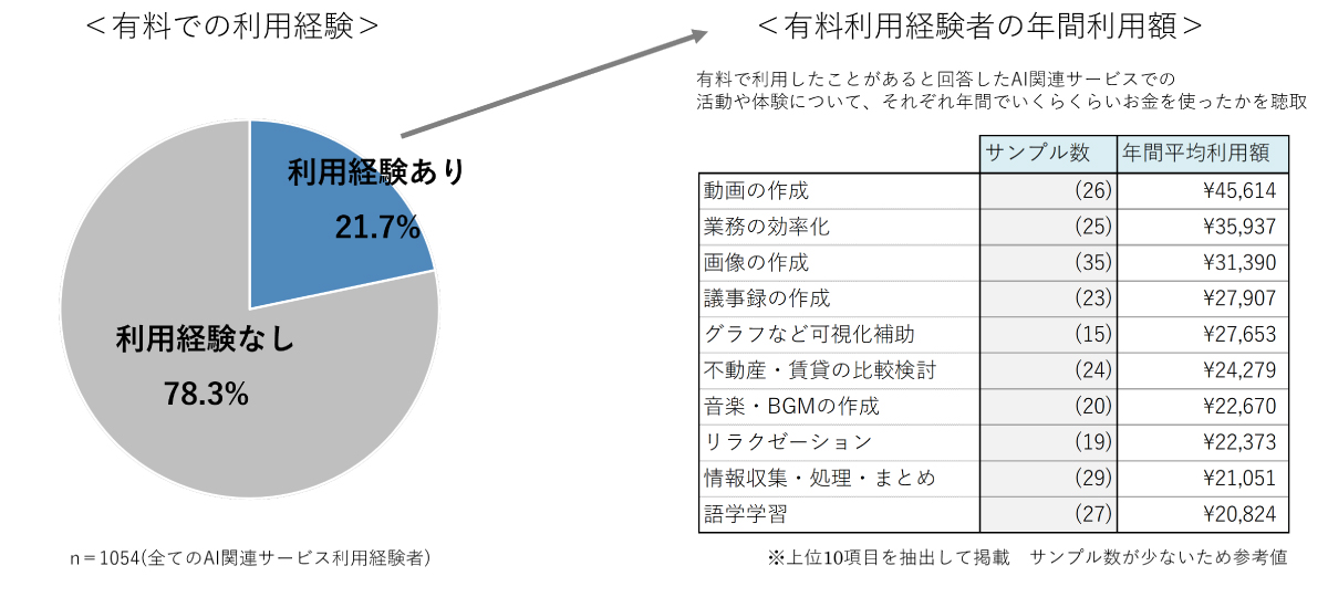 全てのAI関連サービス利用経験者に対して、利用しているAI関連サービスについて有料で利用したことがあるか聞いたところ、有料で利用経験のある人は21.7%となった。