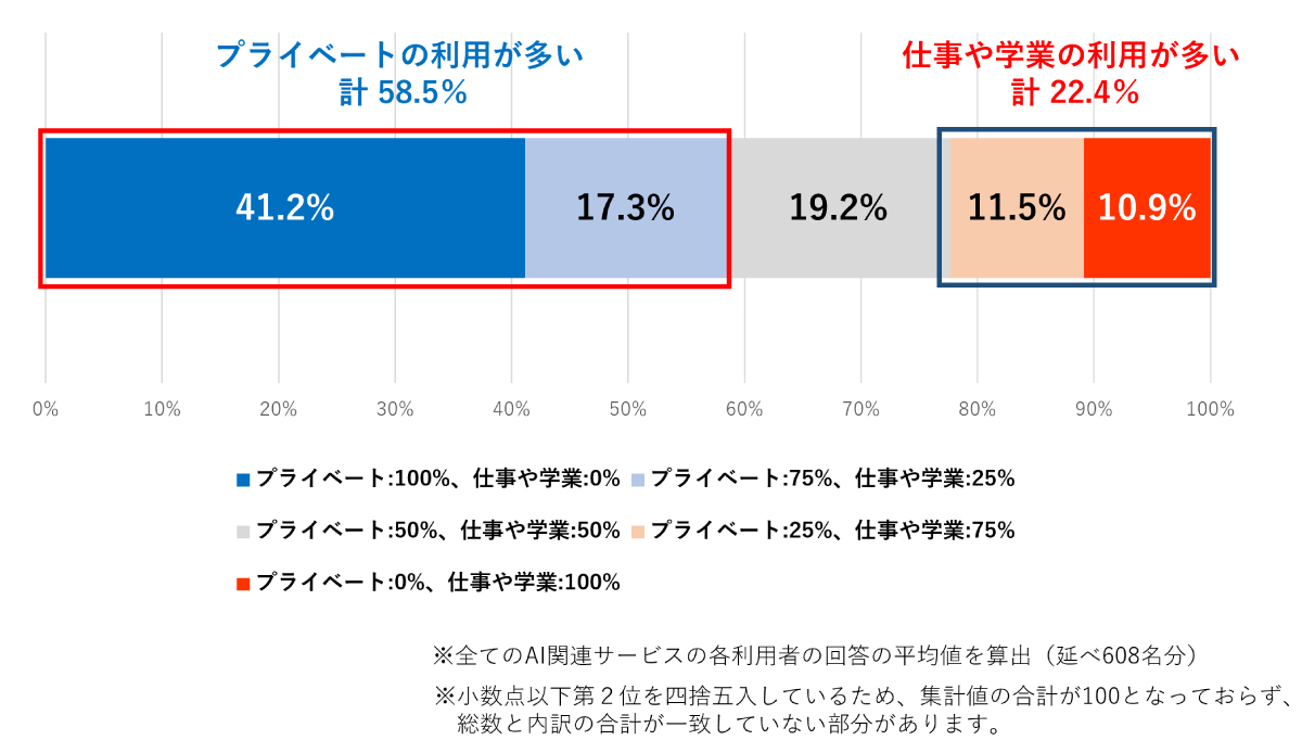 AI関連サービスを仕事や学業、またはプライベートで利用する場合、どのような割合で利用しているか聞いたところ、プライベートでの利用が100%と答えた人が41.2%、プライベートでの利用が75%を占めると答えた人が17.3%に上る結果となった。プライベートでの利用のほうが多い利用者が58.5%と過半数を占めた。