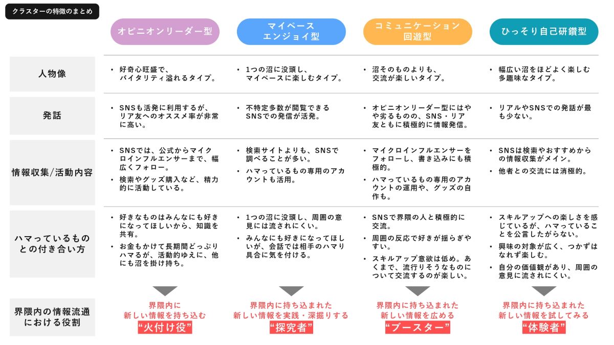 若年層向けのコミュニケーションを考える際には、界隈に存在する各クラスターの情報流通における役割(下図)を把握したうえで、話題化の施策を整理することが大切です。例えば、「オピニオンリーダー型」は火付け役として初期から話題を拡散してくれる可能性が高いですが、さらにロイヤリティの高いファンを育てるために、次は「マイペースエンジョイ型」が好きになってくれそうな体験型施策を考えるといった戦略も考えられます。さらには、「コミュニケーション回遊型」がつい発話をしたくなるような施策として、知識・経験を語りたくなるSNSのハッシュタグを考えたり、ひっそり自己研鑽型のスキルアップ意欲をくすぐるオリジナル検定を作ったりと、柔軟な波及戦略が重要だと考えます。