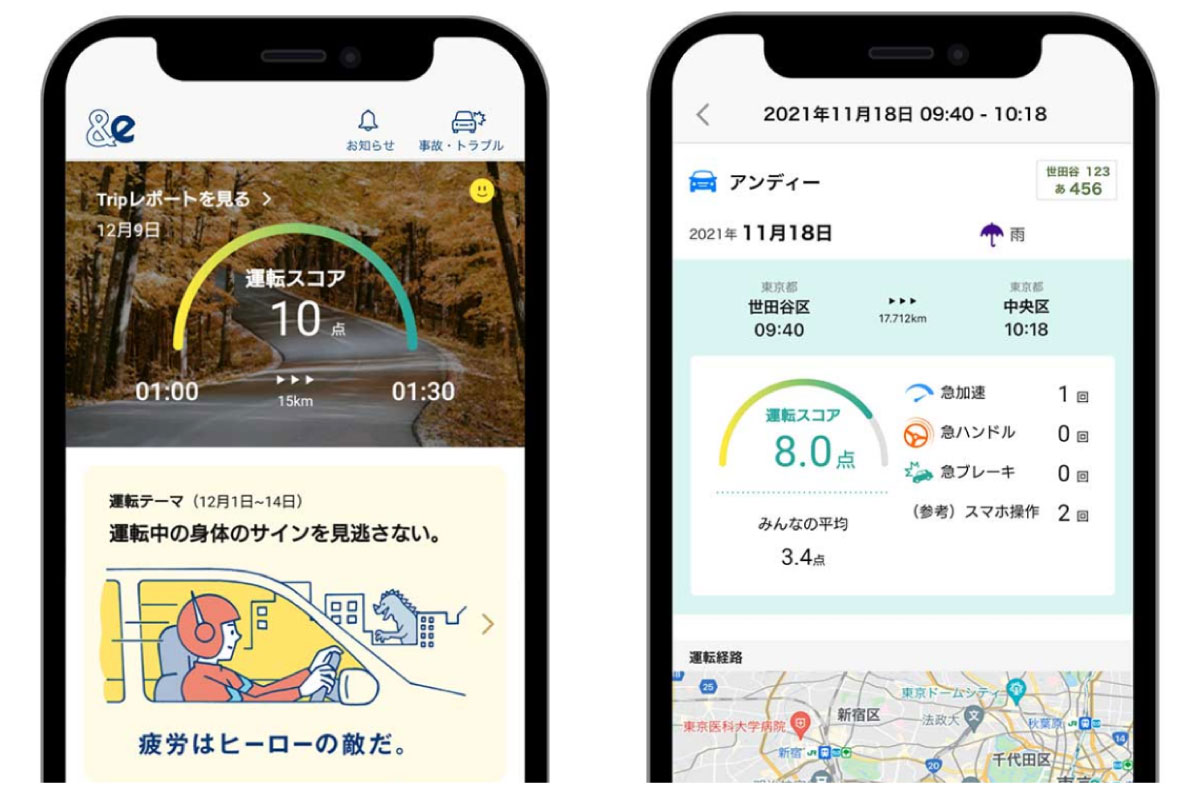 「&e」は、さまざまなテクノロジーと保険を組み合わせたサービスで、お客さまの自動車にIoTセンサーを積載してもらい、このセンサーとスマートフォン向けのアプリを連携させて利用します。