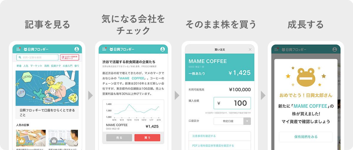 ユーザーインタビューで、投資未経験だった方から「知り合いに日興フロッギーを教えてもらって、定期預金を解約して株を買い始めた」という声をいただきました。