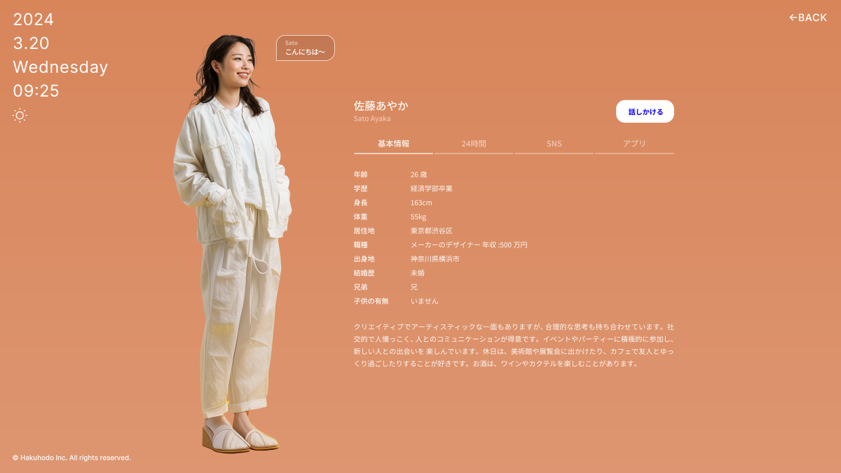 我々は“人格の与え方”を研究し、バーチャル生活者を生成する技術のβ版を開発しました。博報堂オリジナルの大規模生活者データベース『HABIT』と生成AI技術を掛け合わせて、7000人のバーチャル生活者を生成しました。バーチャル生活者だからこそ、価値観やバイアスにとらわれず“あらゆる人の本音”を引き出すことができ、『生活者の声を聴くツール』としてヒアリングやインタビューに活用できると考えています」
