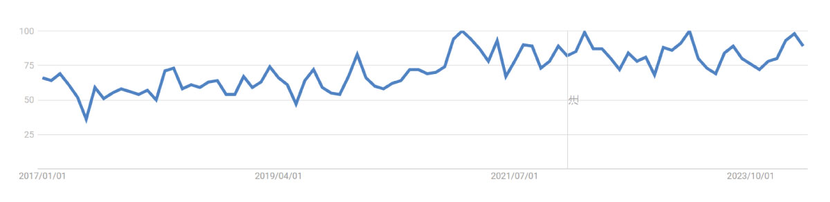 会話のきっかけになるほど、時代を問わず人気のあるアニメですが、グッズも含めて楽しむ生活者はじわじわと増えています。実際にGoogle Trendsで見てみると、ショッピングカテゴリでの「アニメグッズ」の検索数が伸びています。