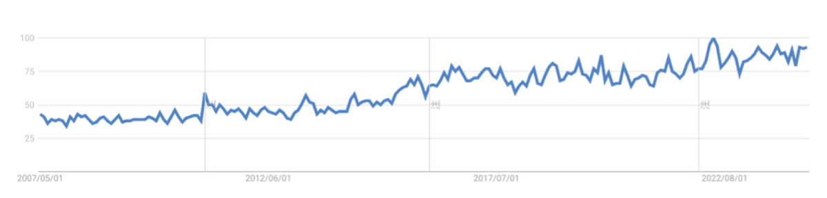 夕涼みが気持ちいい時期だからかしら?と想像するも、ウォーキングへの関心度合いを表す検索数データを見ると10年にわたりじわじわと右肩上がり。どうやら、特段季節が関係している訳ではないようです。