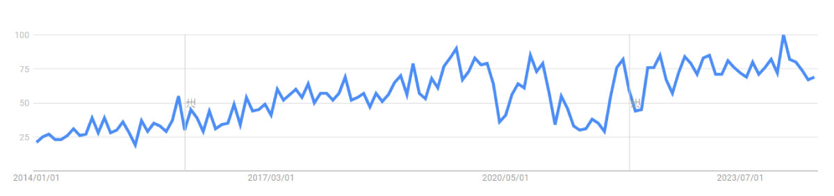 そんな時に次のお店を探すために検索していた「2軒目」というワード。その検索数推移を見てみると、コロナ禍で一度下がってはいるものの、全体的には増加している傾向にありました。