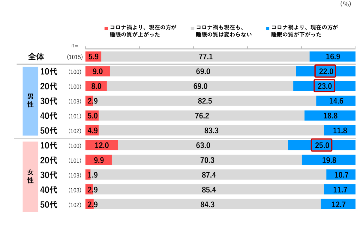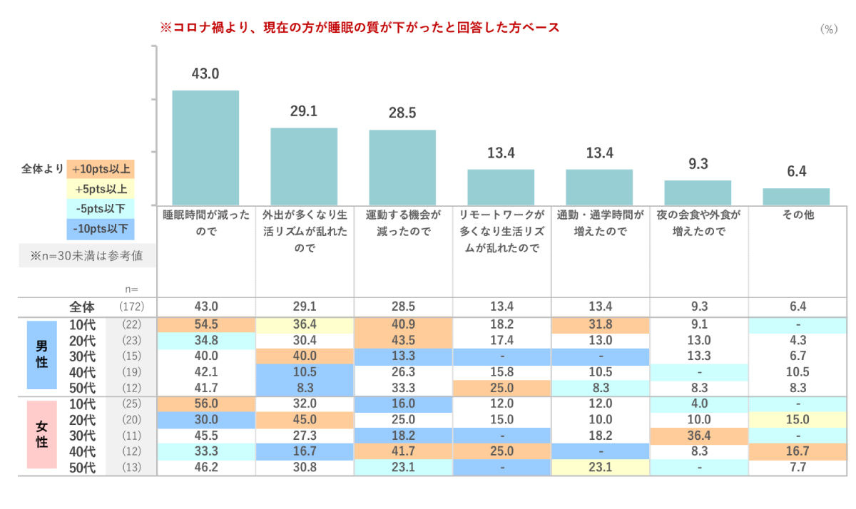 今年実施された調査でも、コロナ禍と呼ばれた時期より睡眠の質が「下がった」と回答した割合は「上がった」と回答した割合よりも高く、睡眠の質が下がった理由として「外出が増えた」「運動する機会が減った」「通勤・通学時間が増えた」「夜の会食や外食が増えた」など、外出制限の緩和による要因が挙げられています。