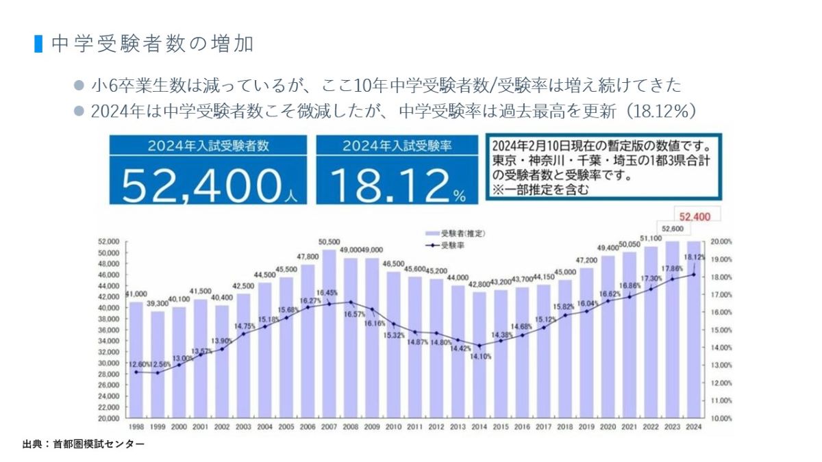 特に首都圏でいうと、やはりニーズが大きいから学校も増加しているのだと思います。高校受験が不要なことをメリットと捉えて、早い時期から将来に向けた教育を望む家庭が増えているのでしょう。保護者には、中学受験の次は大学受験という道筋が描きやすいです。