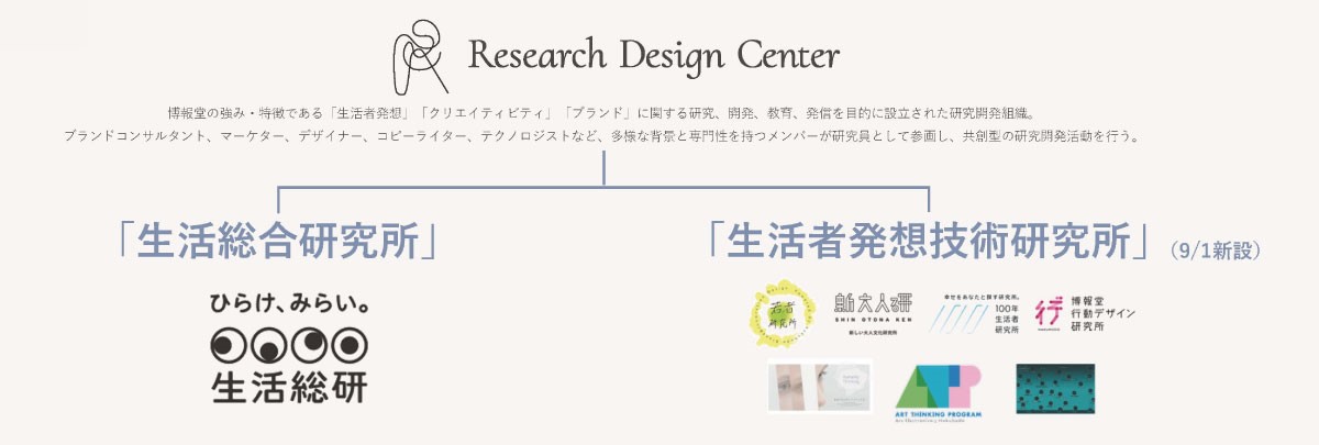 生活発想技術研究所の中には、若者研究所、新しい大人文化研究所、大高さんが所長を務める100年生活者研究所、行動デザイン研究所など、研究所内研究所が多数あります。またお隣のユニットには買物研究所、博報堂DYメディアパートナーズにはメディア環境研究所など、さまざまな切り口の多様な研究機関が集まっています。RDCはある種そのファシリテーターとなり、博報堂グループ内の研究開発機能を束ねつつ、世の中にどのように役立つかをこれからご紹介していこうと考えています。