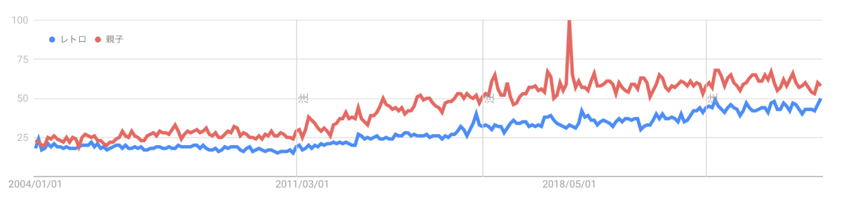Googleトレンドでは「レトロ」「親子」というワードの検索ボリューム推移を調べてみると、どちらのワードも似たような波形で徐々に伸びをみせています。ひとつの可能性として「レトロ」と「親子」が関連するかたちでの盛り上がり性にも期待できるかもしれません。