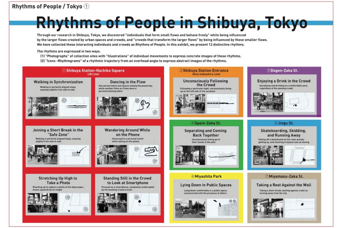 こういった対話の空間の創出だけでなく、博報堂アートシンキング・プロジェクトも展示を行いました。通常の思考回路では見えてこない生活者の主体性・創造性に着目した展示「Rhythms of People」です。都市の主要な構成要素である生活者の動きを「リズム」として見立て、生活者がそこにどのように存在しているか、彼らの主体性を示す振る舞いを東京・渋谷で複数収集し、10のシーンを描き出しました。またその調査手法を元に、フェスティバル会場でのリズム収集を来訪者へ促す体験を加え、参加を楽しむことができる展示に仕立てました。この一連の活動によって、渋谷を例とする大都市が抱える潜在的な課題の発見と共に、都市という空間、生活者の存在の捉え方に対する新たな気づきや、主観的な都市マップ制作への示唆を得ました。