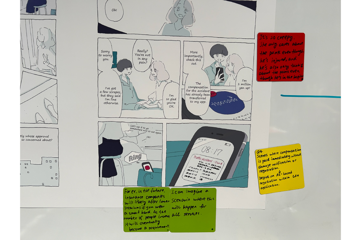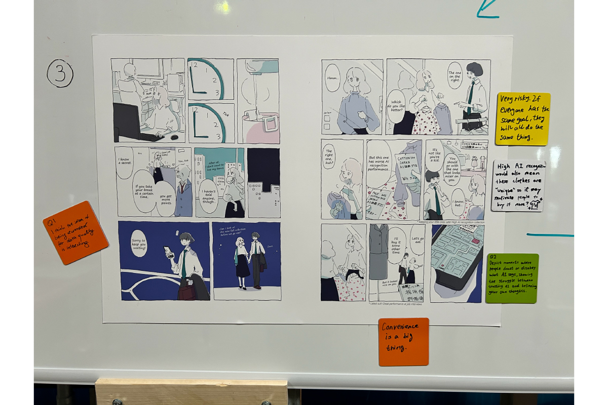 今回展示した「Re-Writing the Script of AI SPEC」プロジェクトは、「AI SPEC」から3つのマンガ作品が展示され、それぞれが独自の視点でAIと社会の関係性を問いかけました。特に注目を集めたのは、紙に印刷されて展示スペースに貼り出された『1:nの蕩揺(とうよう)』です。この作品は、来場者が自由に意見を書き込める仕掛けとして、サステナブルなマグネット付箋を使用しました。これにより、展示そのものが「対話の場」として機能し、多様な意見を通じて議論が深まる場を提供しました。